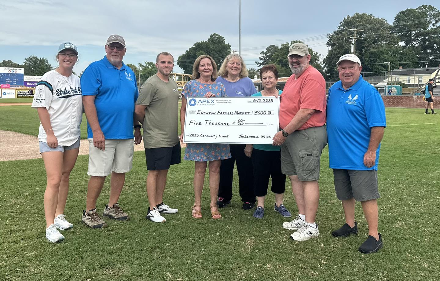 Timbermill Wind Facility Manager Tyler Finley and local representatives Richard Bunch and Win Dale present grant awards to members of the Edenton Farmers Market Board of Directors at an Edenton Steamers game on July 12, 2025.